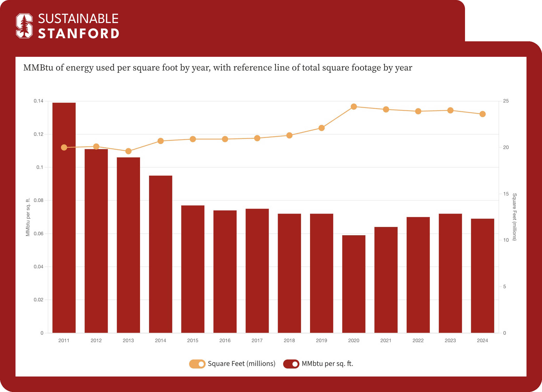 MMBtu of energy used per square foot by year, with reference line of total square footage by year